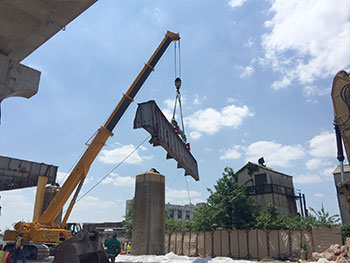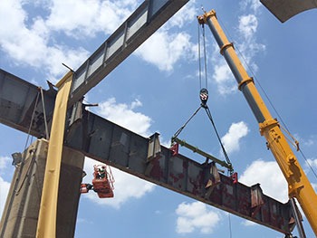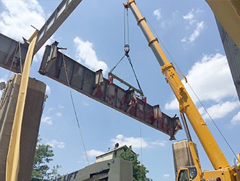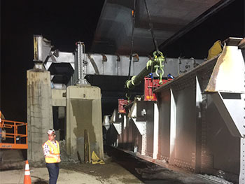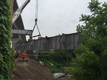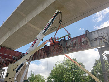 “We are working underneath a new structure that is previously constructed and in and around the next phase of the project that remains under construction at the same time, so we’ve had constraints both above and around our demolition operations,” Schreck elaborated. “It’s a congested site with multiple trades working at the same time. As we’re performing our steel removal, we have ACD/EIG behind us hammering on a pier and completing the substructure removal, contractors drilling on the foundation – it’s just a very constricted site. Our typical span for removal has five floor beams which are approximately 50-75 tons with the new bridge directly above us. This in some cases restricted the available headroom to work within. We rented a 10 ft Mod Beam, 20 ft Mod Beam, and all the associated rigging from LGH.”
