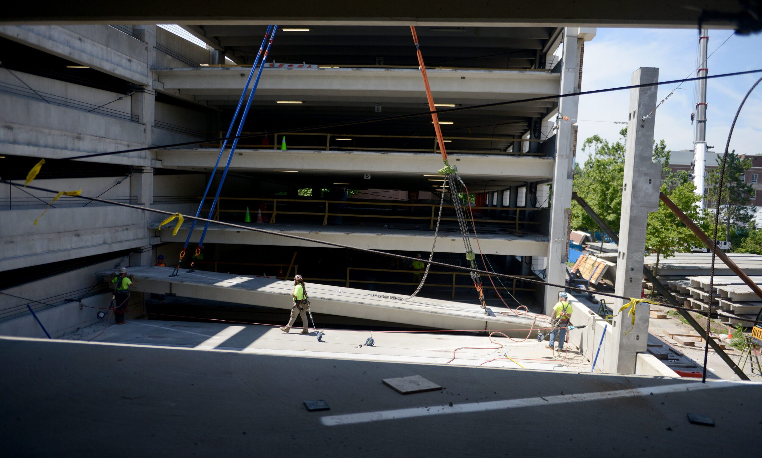 The settlement had compromised a perimeter column and it’s surrounding parts. This created a structure with unclear structural integrity and unforeseen internal forces. This also posed a significant safety risk. Repairing the issue required precise handling of ten massive perimeter spandrels, each weighing over 30,000 pounds, and 29 double-T panels, each weighing over 42,000 pounds. All of this had to be done in a confined space, with the added challenge of reusing every piece of the parking garage that was removed. This project came with several challenges: